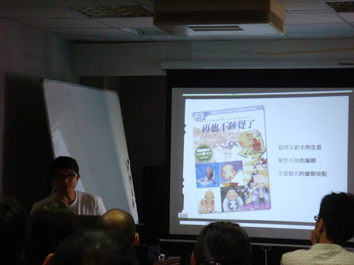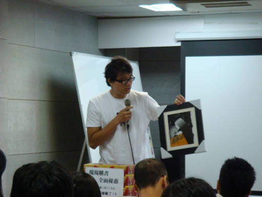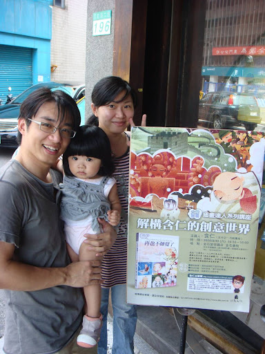 李含仁,這位多才多藝的高個子(190cm夠高了吧),他是藝術家、廣告人、插畫界的大師、創業家、還有吃人不吐骨的老闆。 這樣一號響叮噹的人物。要不是在803當兵的這段孽緣。以Jay桑的天份跟資質,要結交這種"藝術圈"的朋友,機會是趨近於零。 當然,這也要跟Jay桑的厚臉皮扯上一點關係。 當兵時,厚臉皮的要求含仁跟我進行英文教學交換illustrator教學的不平等條件。 退伍後,厚臉皮的邀約最後退伍的含仁,含淚參加老兵的蘭卡威之旅。 結婚前,厚臉皮的麻煩含仁為我的婚禮設計禮品跟會場佈置。 珠兒誕生前,厚臉皮的請含仁賢伉儷,在滑雪團出團的前三天,貼腳(台語=湊數)解救了無法出團的危機。 當然,也因為這樣,他的首場個講(個人演講會),雖然不屬於插畫界的粉絲,甚至跟藝文界連一點點邊都沾不上的 Jay桑,還是厚臉皮的自己報名參加,當然還帶了妻小,想要表示全家動員的心意。 但是,天不從人願,才剛要開場,我家那沒氣質的小朋友,拔拔!!拔拔!!的亂吼亂叫,Jay桑不待演講開始,就倉皇的 抱著珠兒離開會場。所以,無法全程參與也當然無法全程轉播,但是透過含仁跟粉絲們的blog可以了解到這場演講有多成功, 請點這!!當然雖無法全程參加,但照片還是有的: